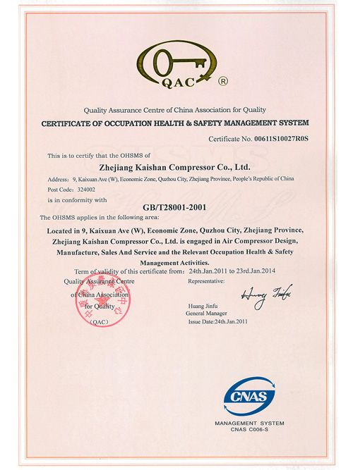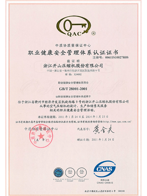 职业健康安全管理体系认证证书